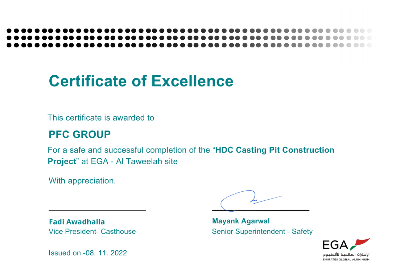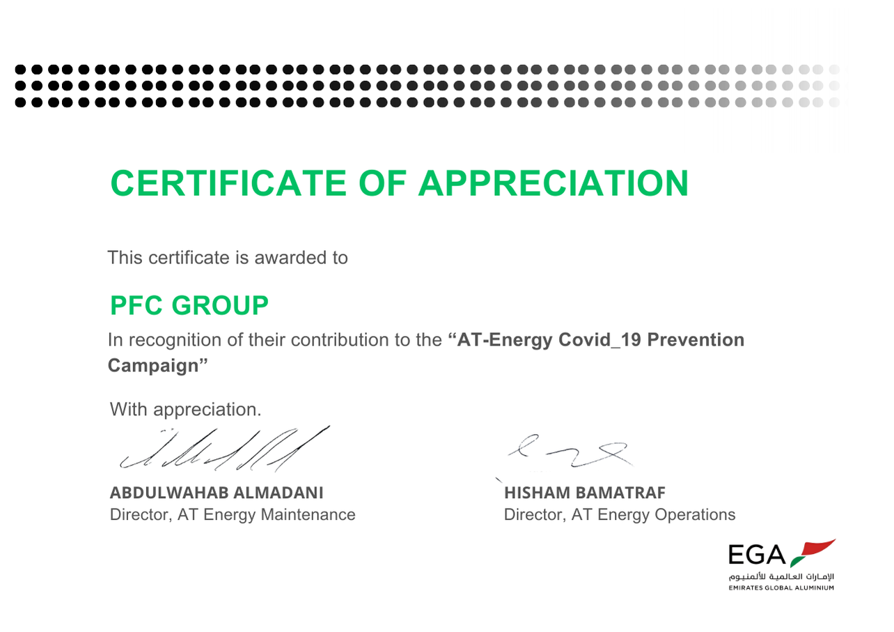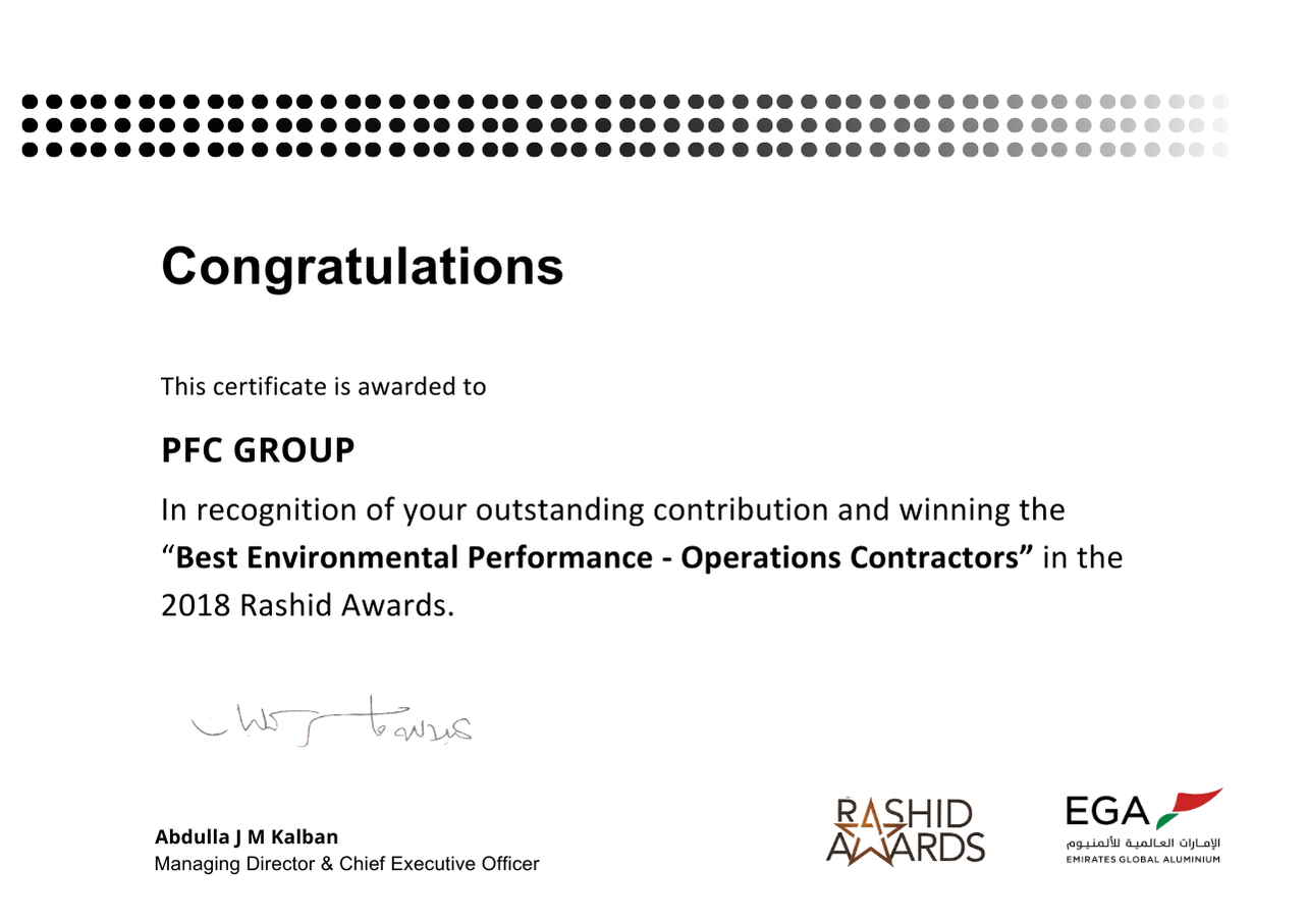 PFC Group strives for a safer working environment for all employees and customers. This target is well established across the company and made clear to our business partners. Our Zero Harm Vision is a commitment shared by all businesses and employees to consider and effectively reduce risks from our activities by seeking innovative solutions, enabling us to get home safely. This has resulted in giving us an excellent milestone in terms of Health and safety. Since our inception, PFC achieved the trust of all our employees and customers. PFC Group has won the Rashid Award which is a recognition award given away by Emirates Global Aluminum.