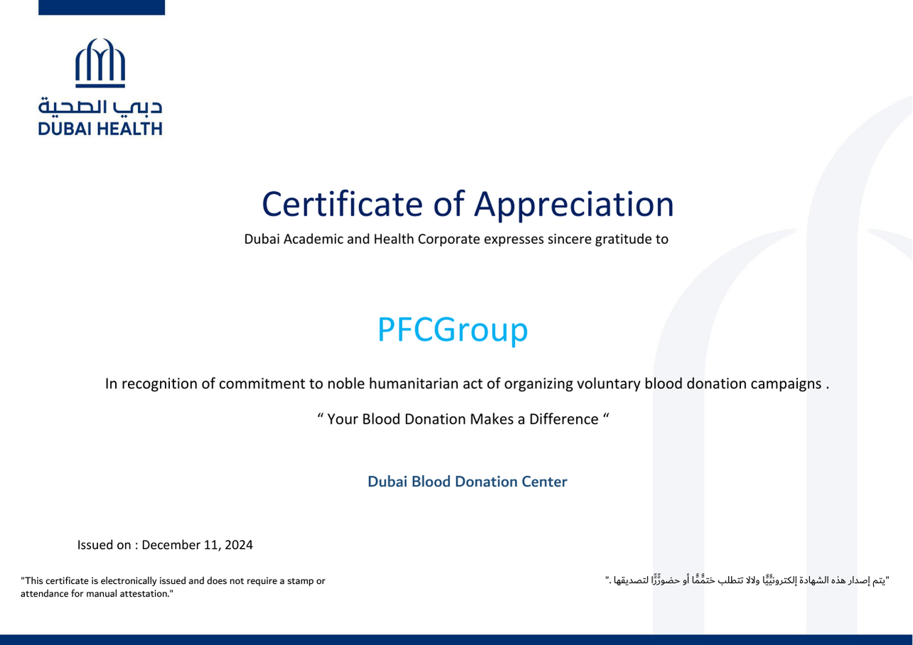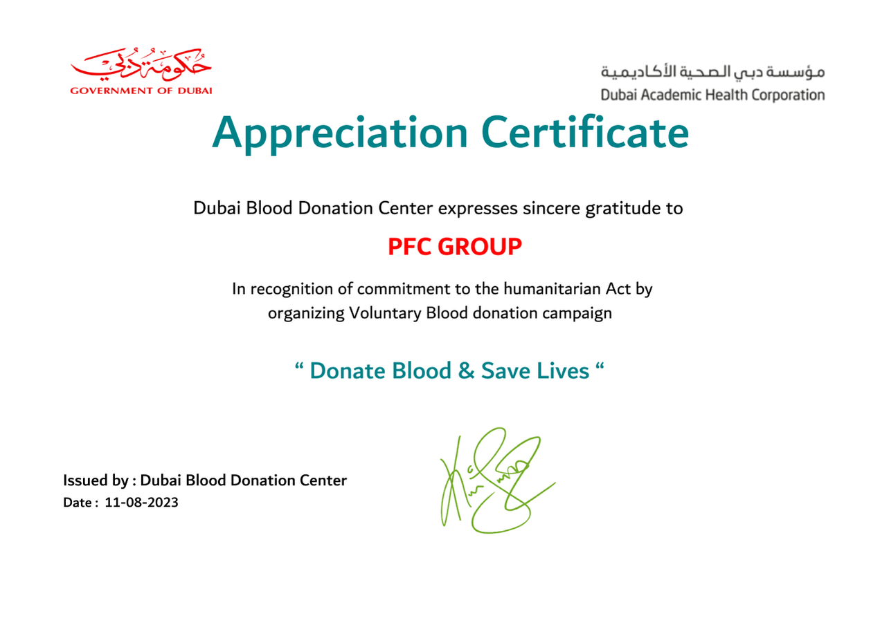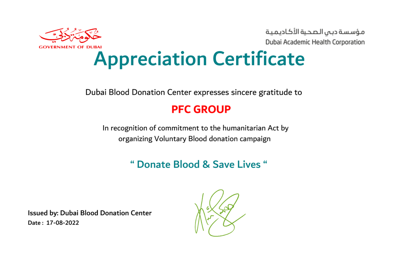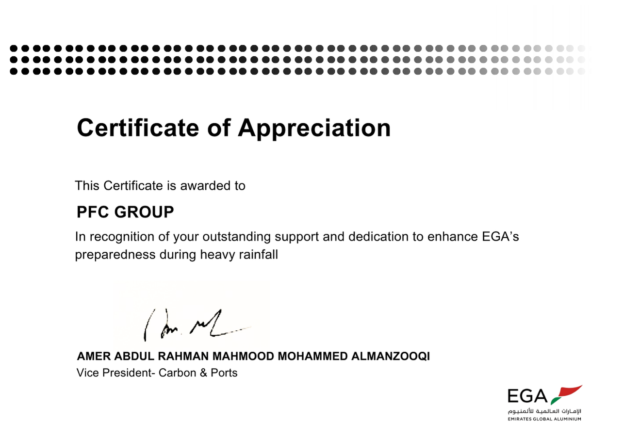 PFC Group strives for a safer working environment for all employees and customers. This target is well established across the company and made clear to our business partners. Our Zero Harm Vision is a commitment shared by all businesses and employees to consider and effectively reduce risks from our activities by seeking innovative solutions, enabling us to get home safely. This has resulted in giving us an excellent milestone in terms of Health and safety. Since our inception, PFC achieved the trust of all our employees and customers. PFC Group has won the Rashid Award which is a recognition award given away by Emirates Global Aluminum.