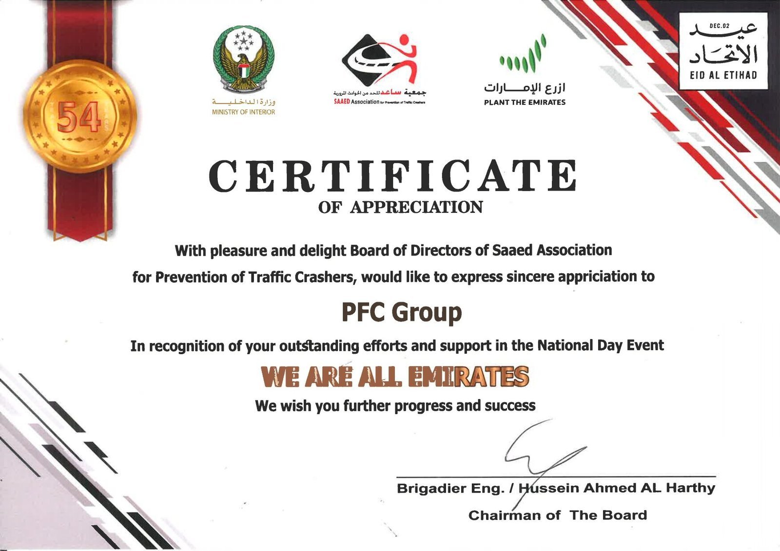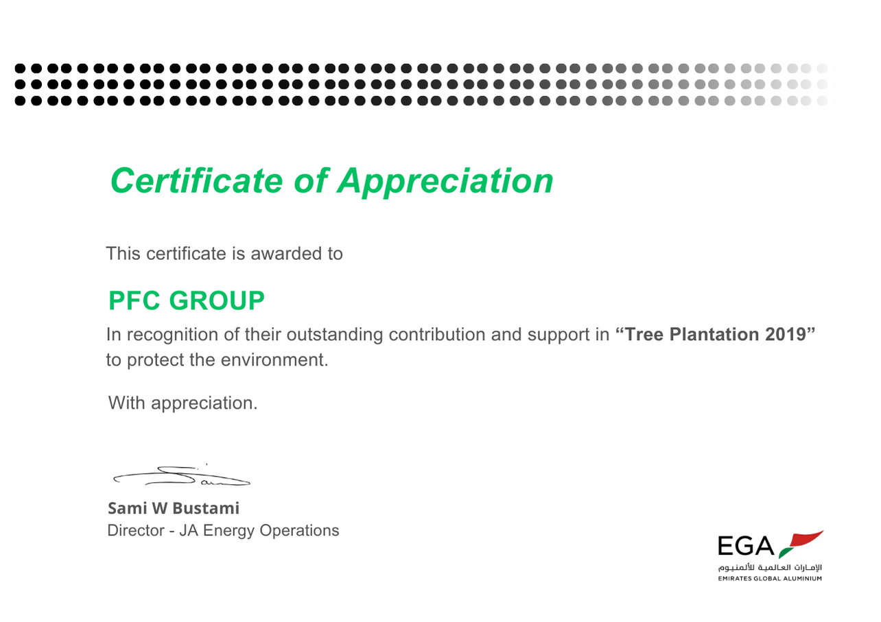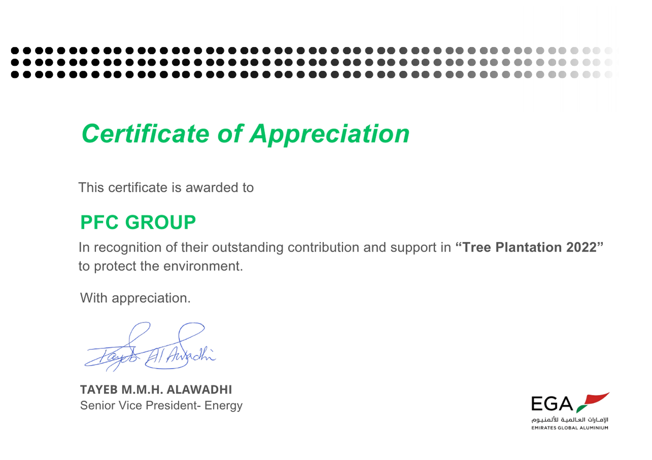 PFC Group is proud to receive an Appreciation Award from Abu Dhabi Municipality, SAAED, and the Ministry of Interior under the Plant the Emirates initiative. This recognition reflects our proactive support for environmental sustainability and the expansion of green spaces across the UAE. Our team actively participated in meaningful tree-planting activities alongside government entities and community partners. The award reinforces our commitment to environmental stewardship and social responsibility. It also aligns with the UAE’s vision for a greener, cleaner, and more sustainable future.
