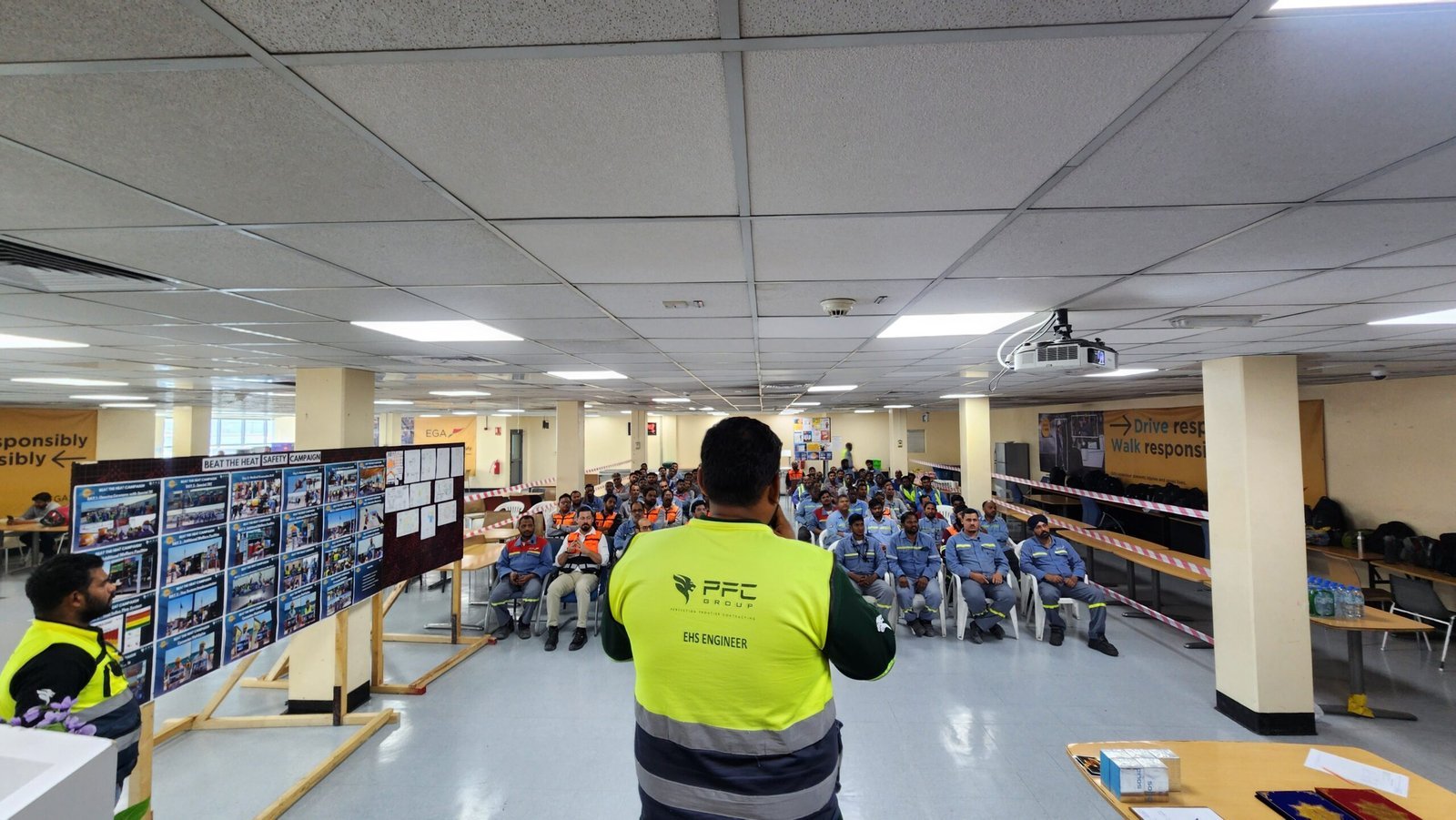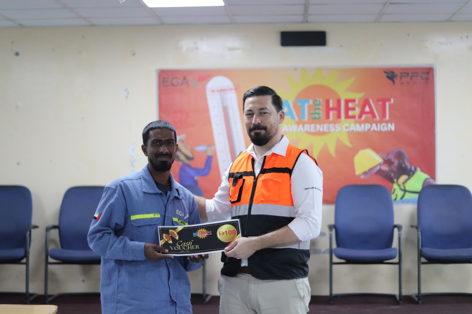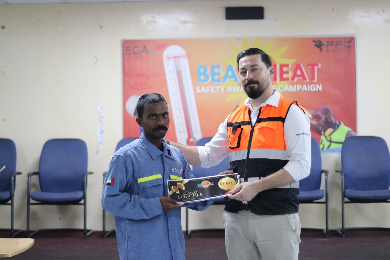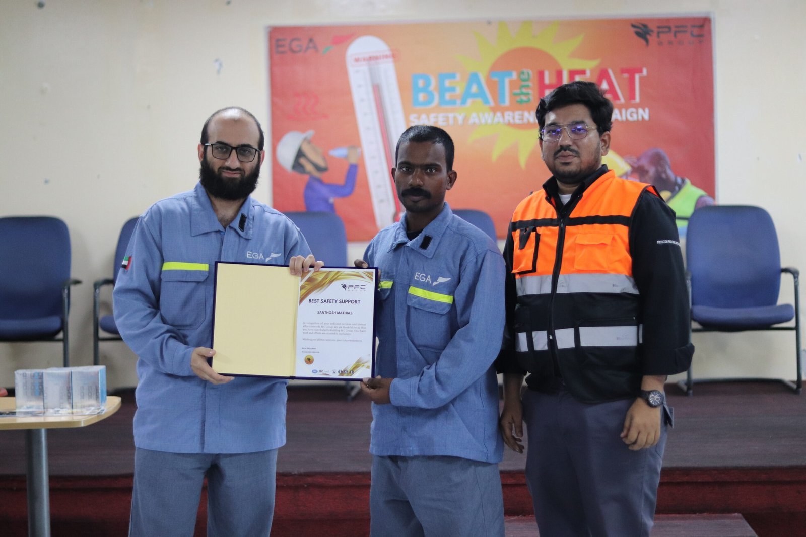 The “Beat the Heat” campaign concluded with a well-organized closing ceremony, attended by key representatives from both EGA and PFC Group. From EGA, Mr. Farooq Sayyed, Mr. Suriya Narayanan Kuberan, Mr. Mubarak Muhammed Bashir, Mr. Muhammed Shamseer Alam, and Mr. Shahin were present to show their support and appreciation for the workforce. From PFC Group, the ceremony was attended by Mr. Fadi Salameh, Mr. Manas Prathan, Mr. Muhammed Nizammudin, Mr. Sreerag Soman, Mr. Parsha Ramali, Mr. Suhail, Mr. Younus, Mr. Arun, Mr. Aravind, Mr. Ashraf, and other safety officers and staff. Mr. Suhail and Mr. Younus welcomed the chief guests and expressed gratitude for their encouragement throughout the campaign. As part of the engagement activities, a drawing competition was held, and three participants were selected and awarded for their creative efforts. In addition, workers and staff were recognized with certificates and awards for their continued dedication to safety at the site. The ceremony ended on a high note with refreshments and a renewed commitment from all participants to prioritize health and safety during the summer season.