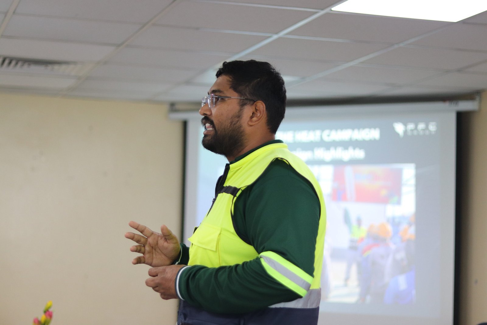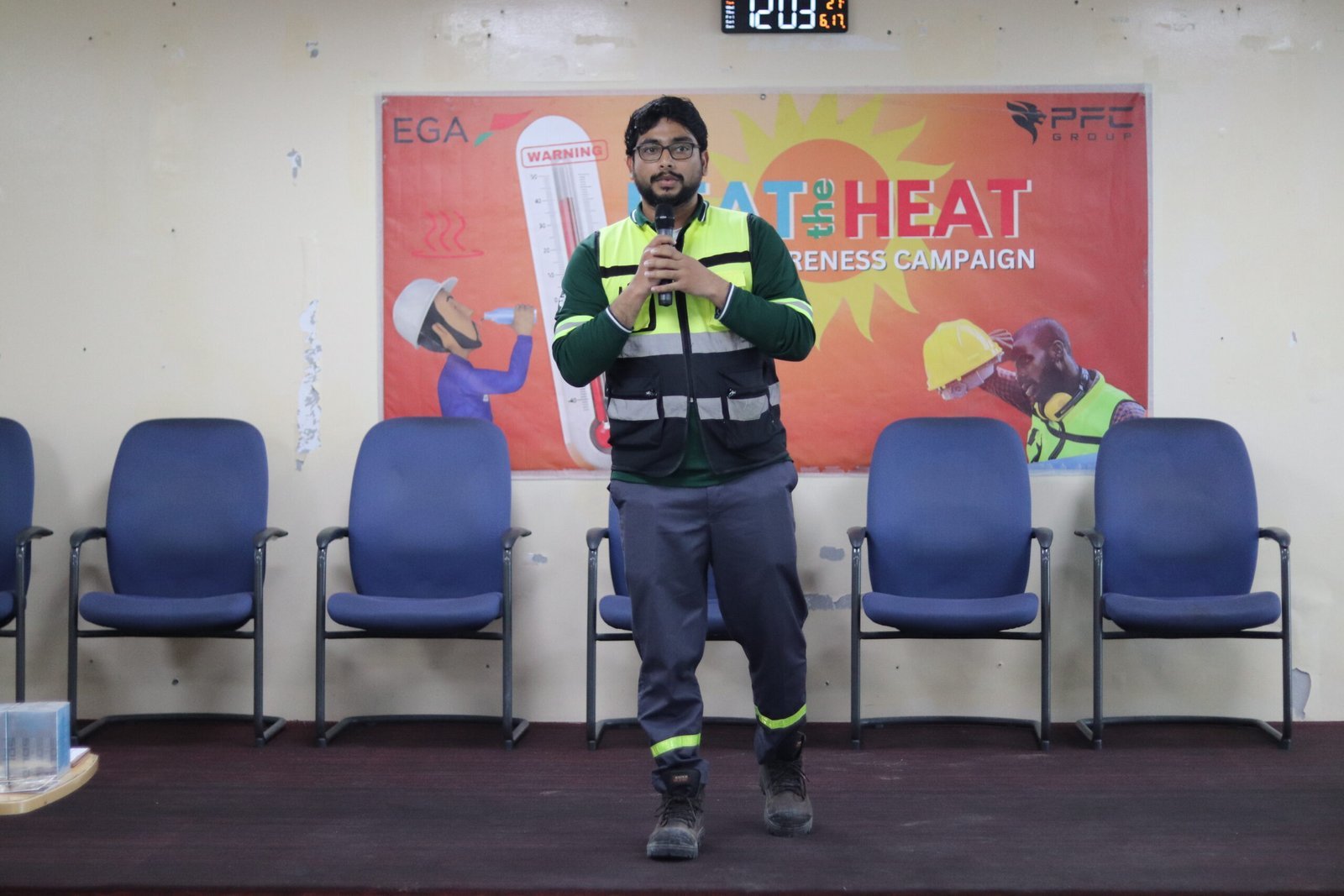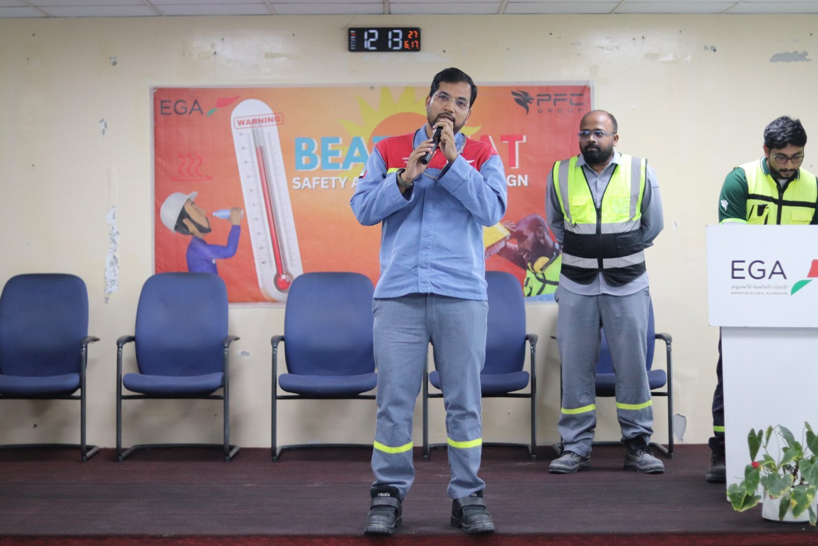 The “Beat the Heat” campaign concluded with a well-organized closing ceremony, attended by key representatives from both EGA and PFC Group. From EGA, Mr. Farooq Sayyed, Mr. Suriya Narayanan Kuberan, Mr. Mubarak Muhammed Bashir, Mr. Muhammed Shamseer Alam, and Mr. Shahin were present to show their support and appreciation for the workforce. From PFC Group, the ceremony was attended by Mr. Fadi Salameh, Mr. Manas Prathan, Mr. Muhammed Nizammudin, Mr. Sreerag Soman, Mr. Parsha Ramali, Mr. Suhail, Mr. Younus, Mr. Arun, Mr. Aravind, Mr. Ashraf, and other safety officers and staff. Mr. Suhail and Mr. Younus welcomed the chief guests and expressed gratitude for their encouragement throughout the campaign. As part of the engagement activities, a drawing competition was held, and three participants were selected and awarded for their creative efforts. In addition, workers and staff were recognized with certificates and awards for their continued dedication to safety at the site. The ceremony ended on a high note with refreshments and a renewed commitment from all participants to prioritize health and safety during the summer season.
