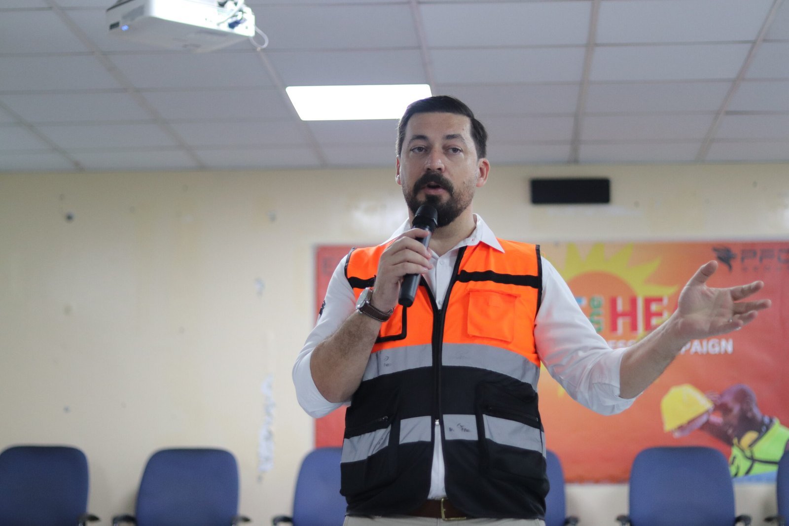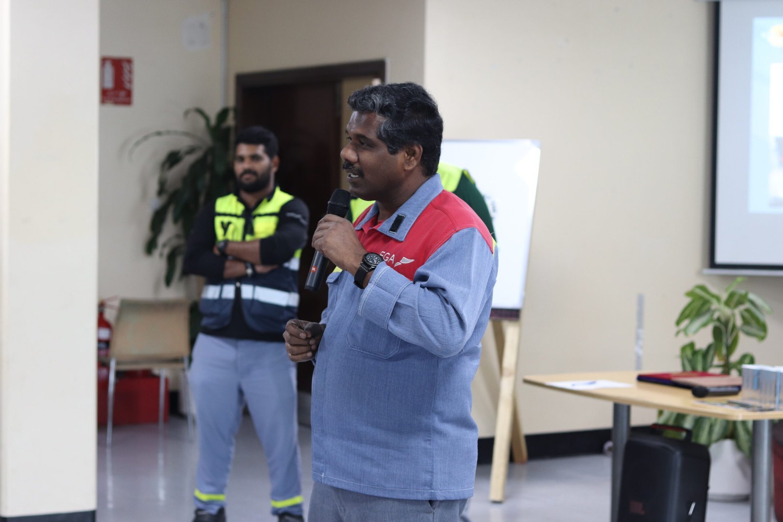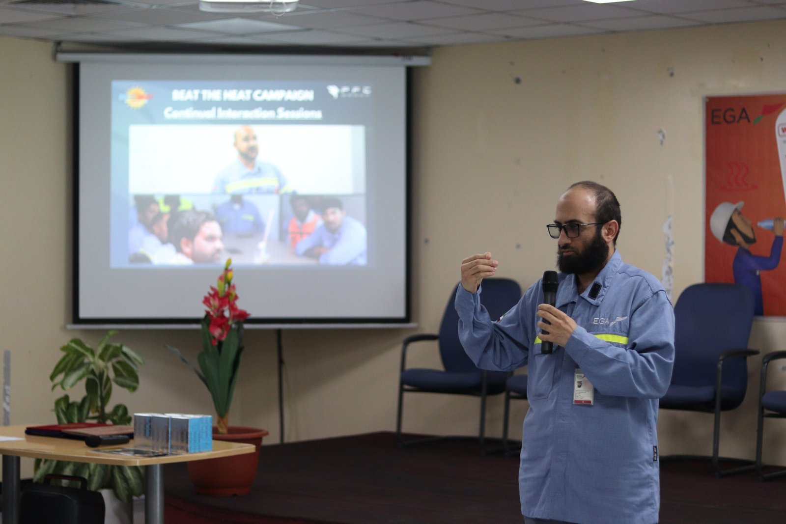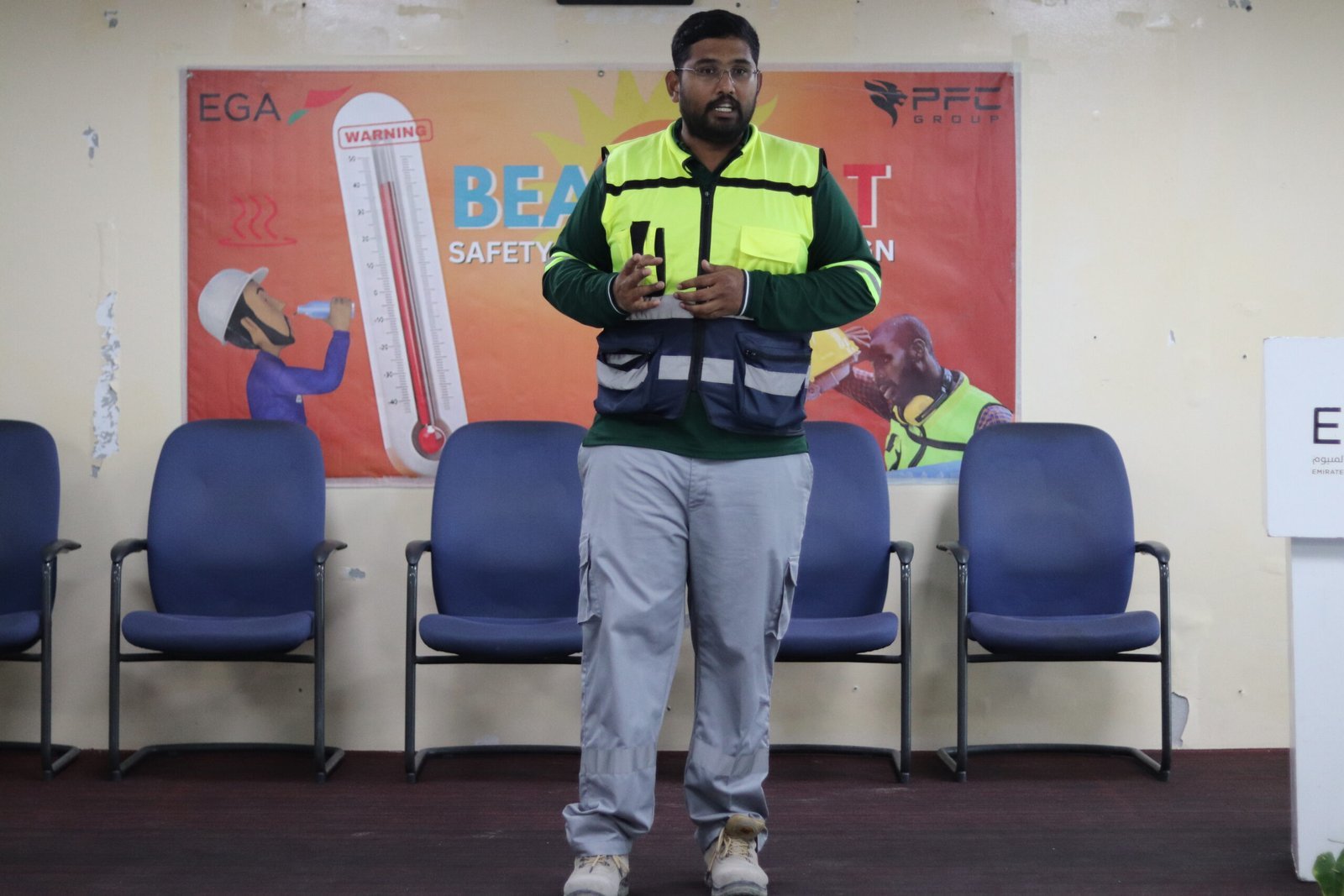 The “Beat the Heat” campaign concluded with a well-organized closing ceremony, attended by key representatives from both EGA and PFC Group. From EGA, Mr. Farooq Sayyed, Mr. Suriya Narayanan Kuberan, Mr. Mubarak Muhammed Bashir, Mr. Muhammed Shamseer Alam, and Mr. Shahin were present to show their support and appreciation for the workforce. From PFC Group, the ceremony was attended by Mr. Fadi Salameh, Mr. Manas Prathan, Mr. Muhammed Nizammudin, Mr. Sreerag Soman, Mr. Parsha Ramali, Mr. Suhail, Mr. Younus, Mr. Arun, Mr. Aravind, Mr. Ashraf, and other safety officers and staff. Mr. Suhail and Mr. Younus welcomed the chief guests and expressed gratitude for their encouragement throughout the campaign. As part of the engagement activities, a drawing competition was held, and three participants were selected and awarded for their creative efforts. In addition, workers and staff were recognized with certificates and awards for their continued dedication to safety at the site. The ceremony ended on a high note with refreshments and a renewed commitment from all participants to prioritize health and safety during the summer season.