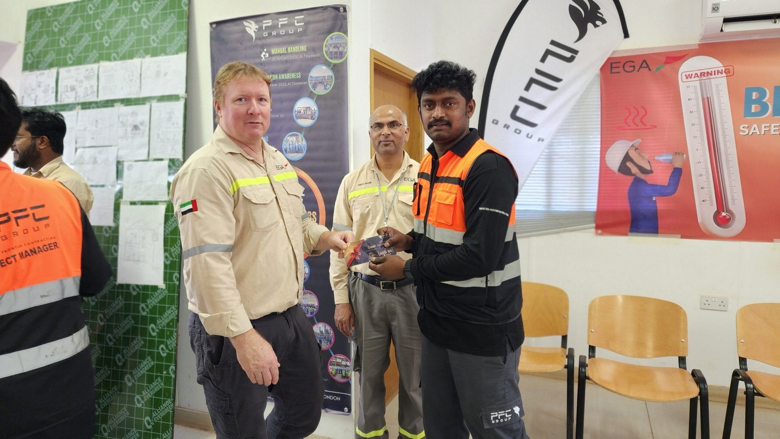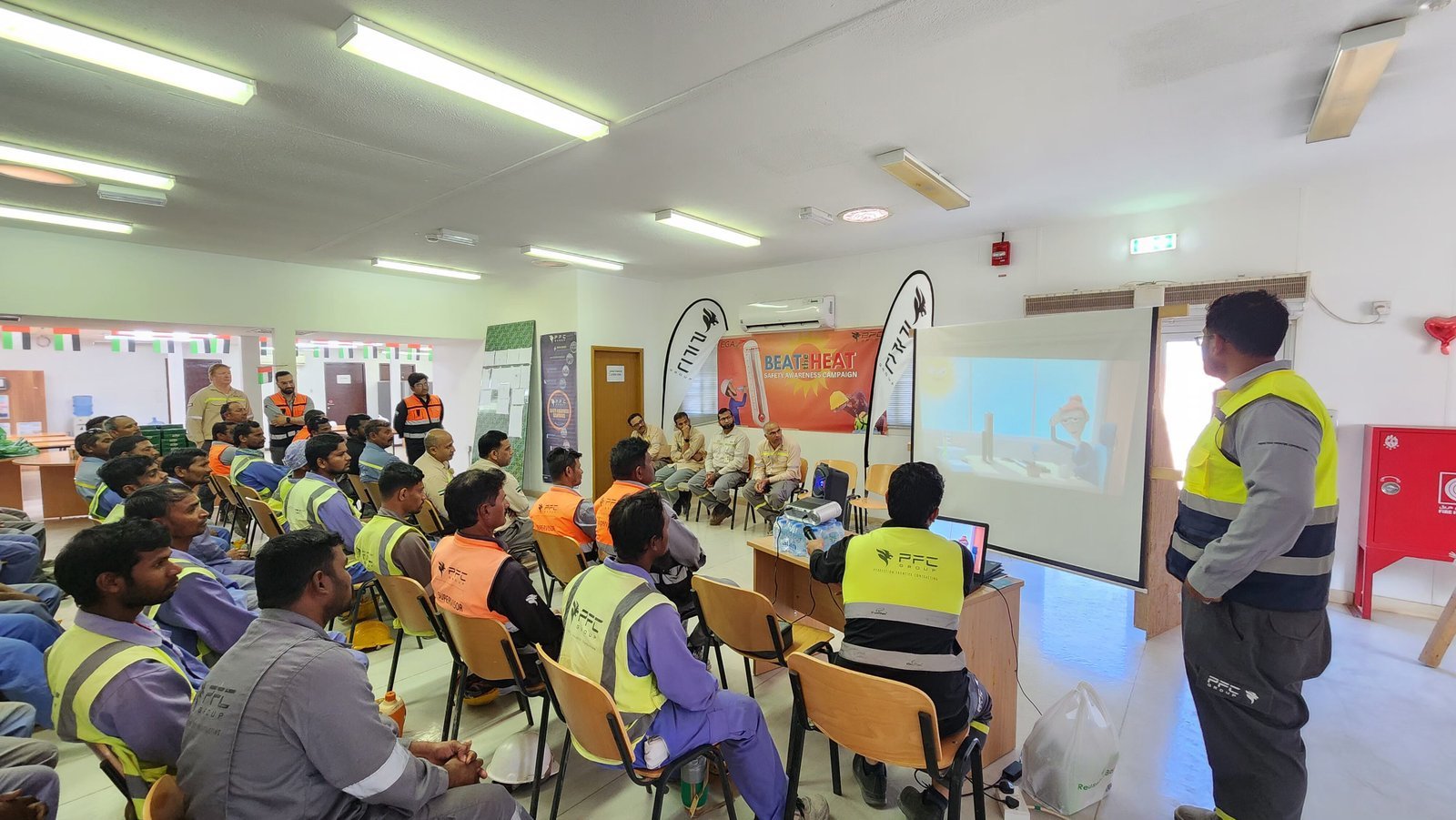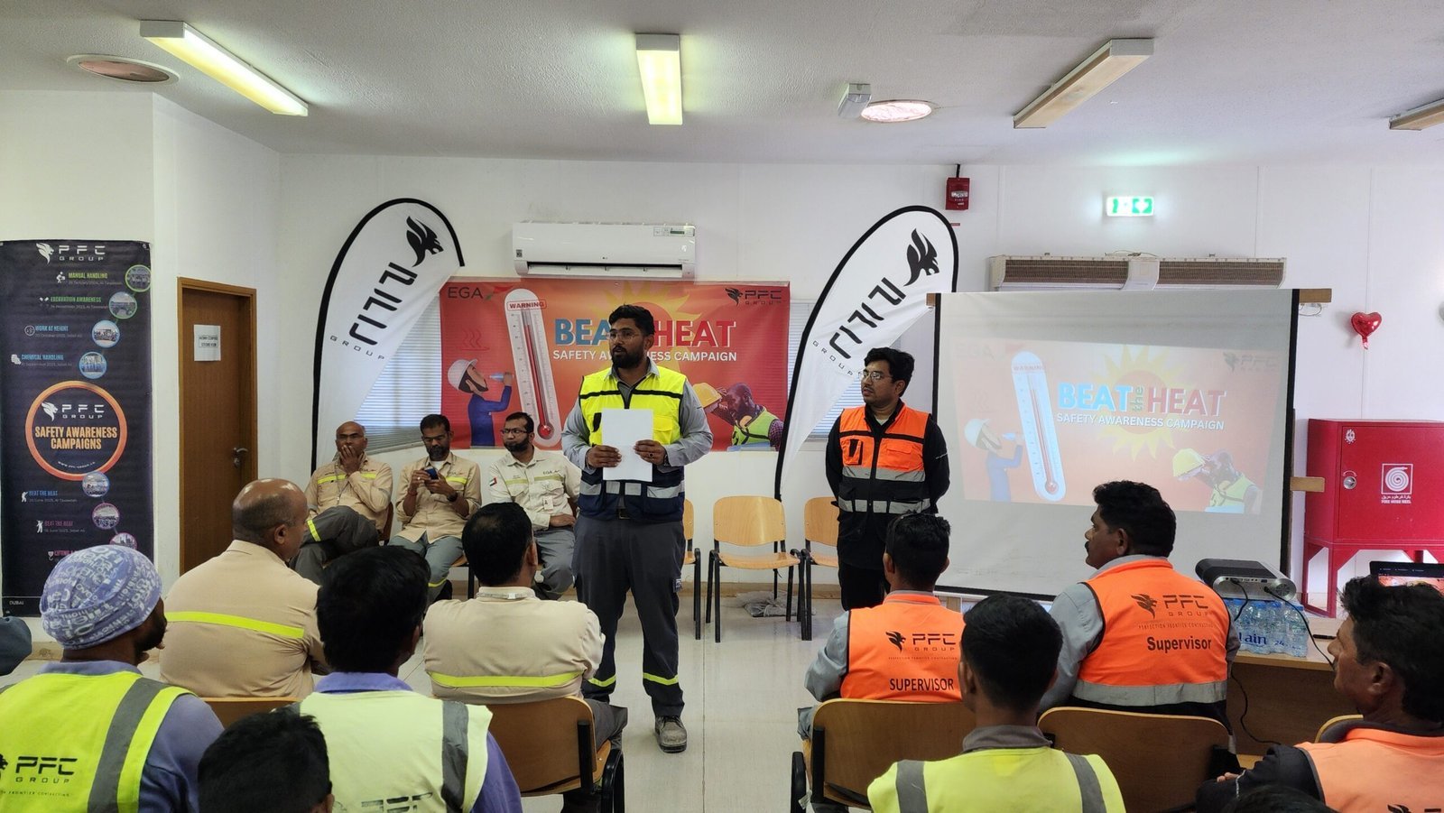 PFC Group successfully conducted the u201cBEAT THE HEATu201d Safety Awareness Campaign for its employees at the Al Taweelah site on 06-06-2024. The initiative focused on educating the workforce about heat stress prevention, hydration, and best practices for working safely under extreme summer conditions. The campaign included toolbox talks, distribution of oral rehydration salts (ORS), shaded rest areas, and awareness materials to reinforce the importance of heat illness prevention. The event highlighted PFC Groupu2019s commitment to employee health, safety, and well-being during the peak summer season.